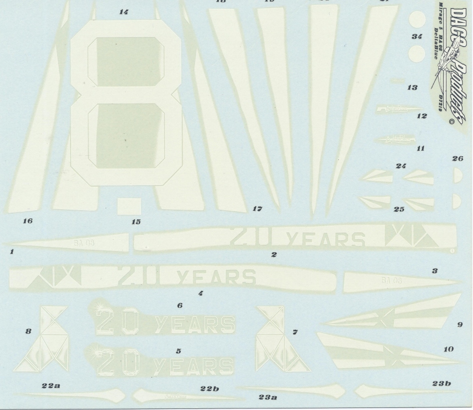 | 1st wing - 8th sqn "Cocotte" - 20 ans "DeltaBlue" - Bierset AB - 1990 - Mirage 5BA (BA-08) | Decal Daco Product 7219 | View | |