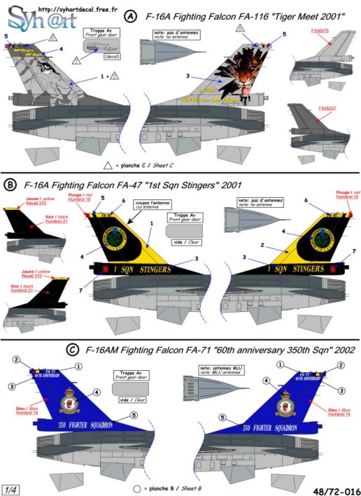| 10th Wing - 31th sqn "Tiger" - Tiger Meet 2001 - 50 ans - F-16AM (FA-11) | Decal Syh@rt 72-016 / 48-016 | View | View |